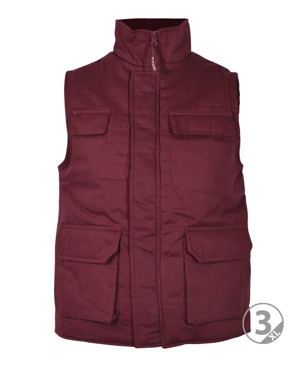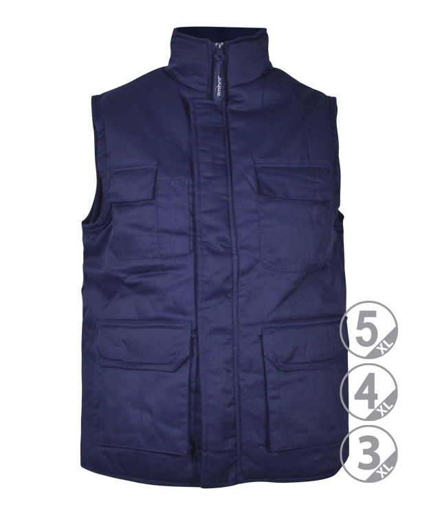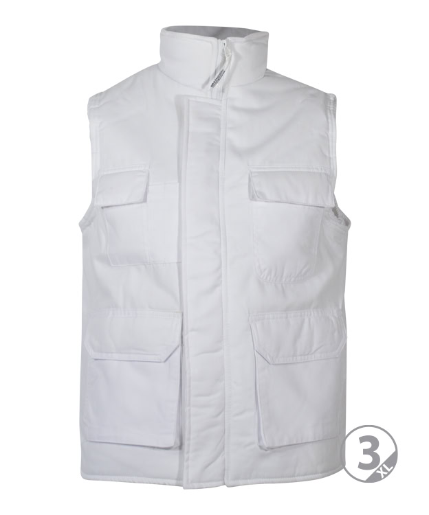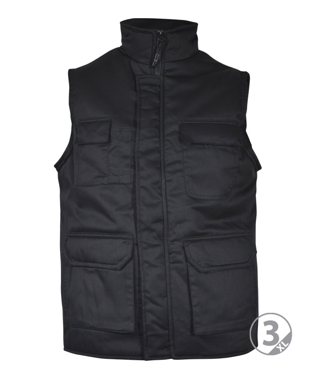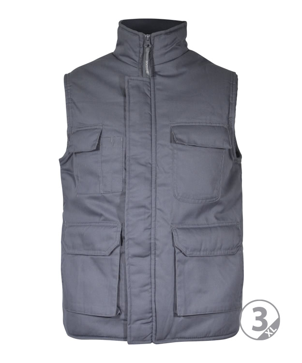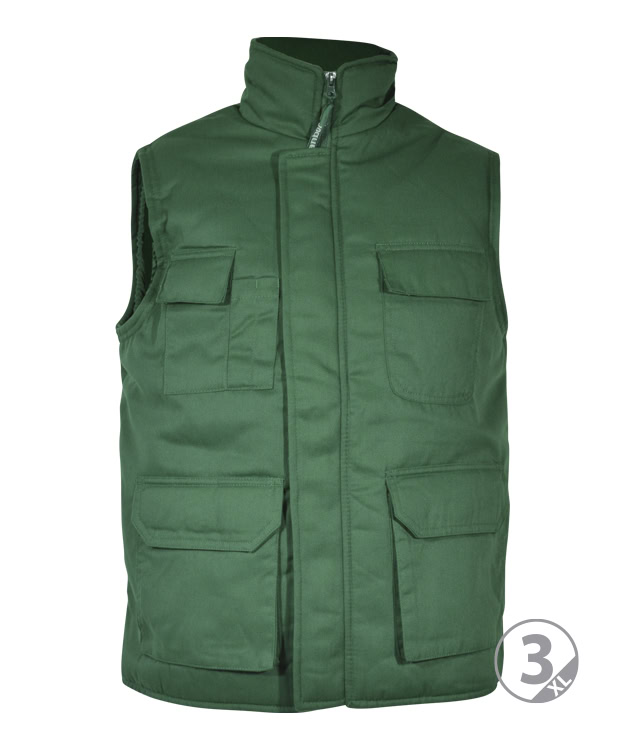 Chaleco alcolchado. Exterior: Tejido sarga poliéster/ algodón, 200 gr. Interior: 100% poliéster acolchado. Chaleco laboral multibolsillo de cremallera central con tapeta y cierre velcro. Cortavientos en bocamanga. Trasero con faldón. 6 bolsillos exteriores y 1 bolsillo interior.
